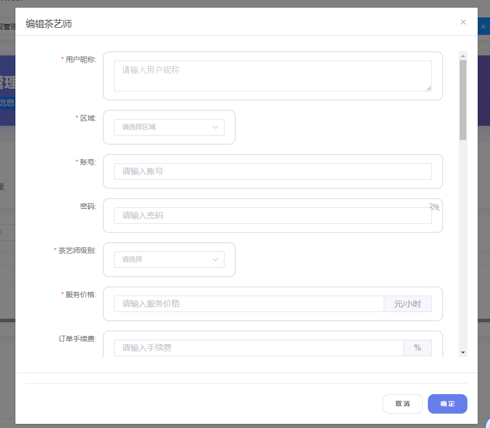 #### 模块意义: 管理系统中的茶艺师信息,包括基本信息、服务价格、评分等配置