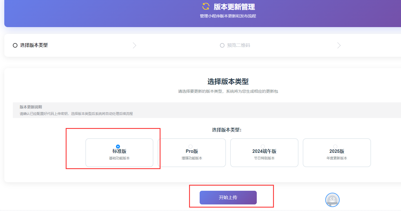 ### 模块意义: 根据市场变化与实际运营需求,系统约每个月最少更新一次,一般包含新增功能,修复已知问题等。 ### 更新步骤: 点击【标准版】-【开始上传】,上传成功后,按照提示操作,发布新版本即可