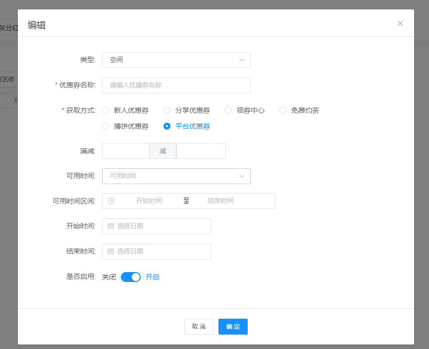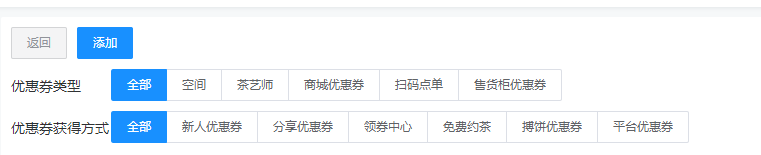 ### 模块意义: 优惠券的设置可以促进门店的客户使用率 ### 优惠券支持类型: 包间、茶艺师、商城、扫码点餐、无人售货柜等
