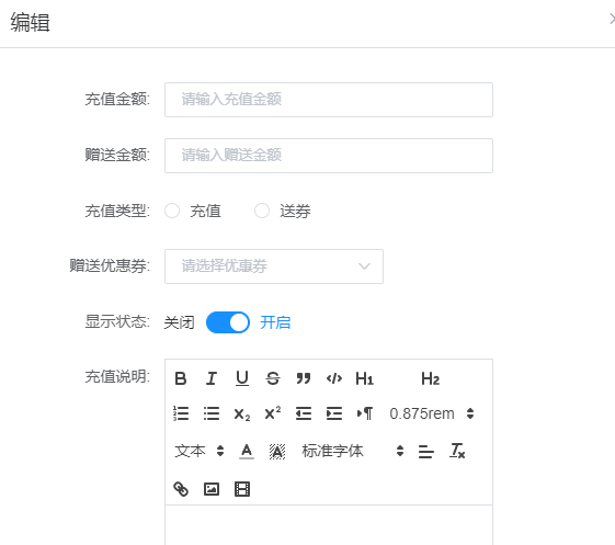 ### 模块意义: 用于连锁储值设置,可关联多种营销方式,实现门店复购率暴增需求;该模块的储值金额是直接储值到平台中的,不会到达独立门店中!! ❤️ 如需设置储值指定门店需在【商户管理】-【商户门店】-【营销】-【储值】中进行单独设置。便于门店进行独立的储值营销活动。  #### 充值可以配置赠券、赠送余额、赠送会员等。 如充值100元,赠送10元,实际到账110元;也可以配置好优惠券后,组合赠券,如储值100元赠送10元再赠送20元满减券(满减券可自定义配置)  储值卡的灵活运营可以增加门店的客户粘性